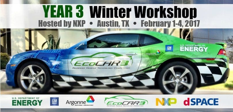 The EcoCAR 3 Year 3 Winter Workshop will be co-sponsored by NXP Semiconductors and dSPACE, Inc. and hosted by NXP in Austin, TX from February 1 – 4, 2017. The Winter Workshop is an important time for EcoCAR students to take stock of their progress and gain more knowledge and skills that will help them tackle the rest of the year heading into May’s competition.