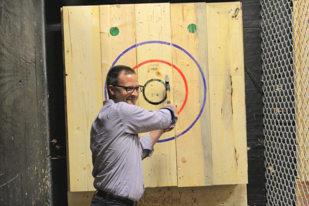 After a full day of training, dSPACE invited the teams to The Backyard Axe Throwing League to test their axe throwing skills. It was a tough competition, but congratulations to Drew Hayworth from Virginia Tech and Mahaveer Kantilal Satra from Ohio State University for being crowned Axe Throwing Champions of the dSPACE EcoCAR Fun Night!