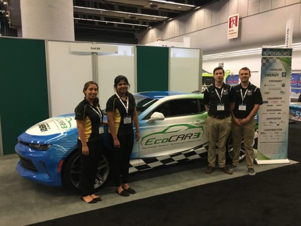 Last week, students from McMaster University and the University of Waterloo were given the opportunity to represent EcoCAR 3 at the 29th Electric Vehicle Symposium (EVS) in Montréal, Québec, Canada. EVS is the largest international electric vehicle conference and has been bringing together industry, government and academia to address technical, policy and market topics related to vehicle electrification since 1969. At the conference, team members were able to talk to industry professionals and even competition sponsors about EcoCAR 3 and their journey to transform a Camaro into a hybrid electric vehicle.