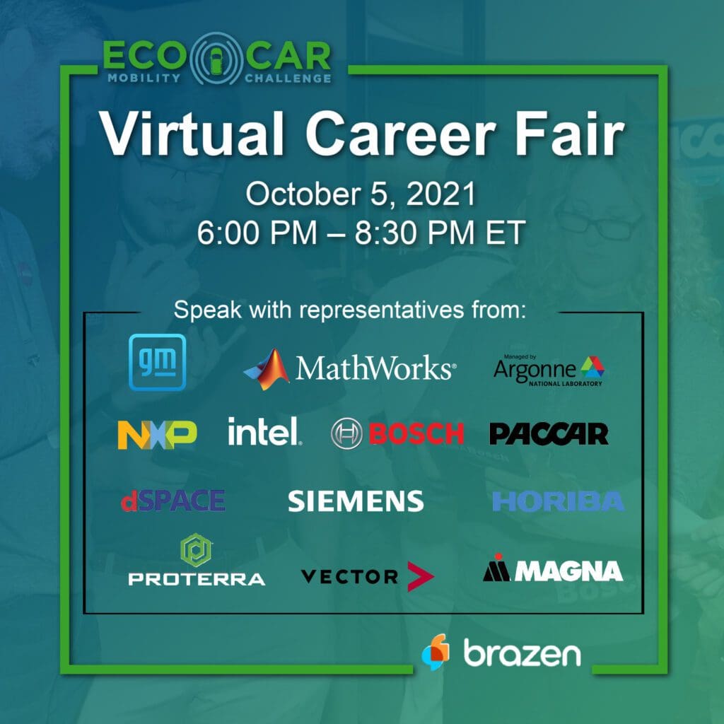 On Tuesday, October 5th from 6-8:30 p.m. ET, we will be hosting the Year 4 EcoCAR Virtual Career Fair! Through the online platform Brazen, students will have the opportunity to meet with EcoCAR industry sponsors who are hiring for internships and full & part time positions.