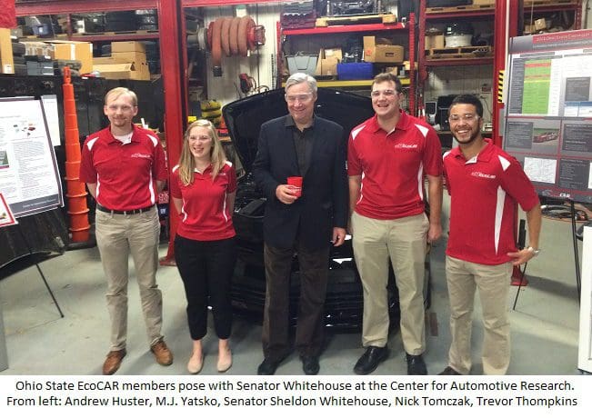 Senator Whitehouse visited the team at the Center for Automotive Research on Oct. 31, 2015, as part of a multiday trip through Ohio to see sustainable energy research in action. Whitehouse serves on the Committee of Environment and Public Works, co-founded/co-chairs the Bicameral Task Force on Climate Change and addresses the Senate weekly with his “Climate Change: Time to Wake Up” speeches. Whitehouse’s trip to Ohio was documented in his Senate address on Nov. 10, 2015, which can be found here (at the 12:30 mark, you may see some familiar faces!).