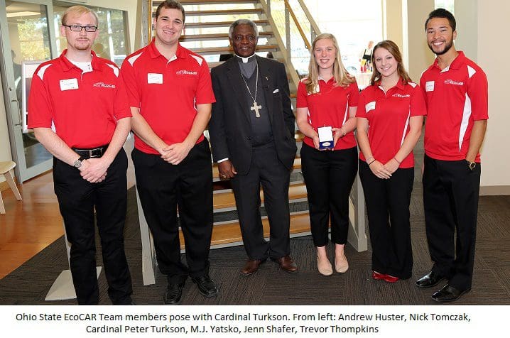Cardinal Turkson is a Roman Catholic Bishop, President of the Pontifical Council for Justice and Peace, and is heavily involved in the Pope’s current environmental efforts. While in Columbus, Ohio, he spent time as a guest of The Ohio State University School of Environment and Natural Resources and met with a group of students and faculty including five Ohio State EcoCAR team members. Turkson and the team discussed EcoCAR 3 and the future of automotive sustainability in our time together on Nov. 2, 2015.