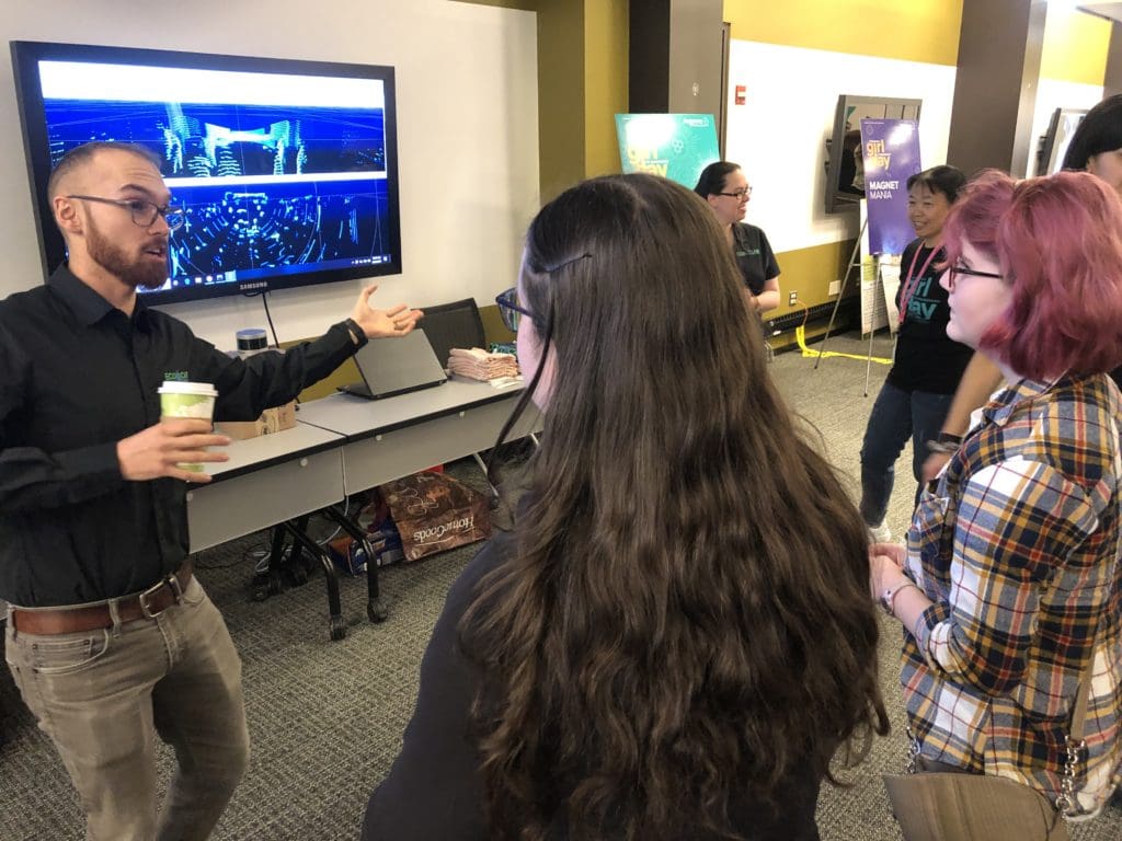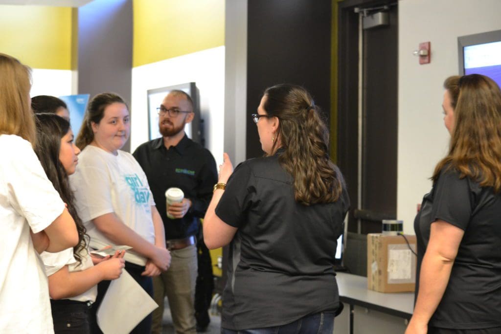 EcoCAR organizers spent the day demonstrating a Velodyne LIDAR system. This captures how autonomous vehicles use laser systems to determine the presence and distance of objects around them. The resulting images were displayed to the attendees.