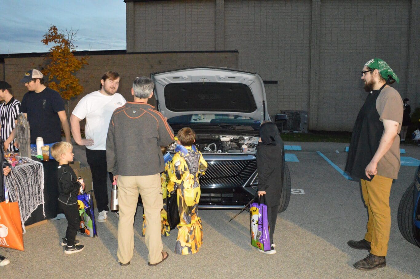 Students from the WVU EcoCAR team participated in handing out candy to attendees and answering questions about the vehicles and Advanced Vehicle Technology Competitions (AVTCs). Patrons were encouraged to look at the interiors of each car, including under the hoods and in the trunks. EcoCAR students were able to tell patrons about how the Chevrolet Blazer was previously a gas vehicle that was made a hybrid and enhanced with autonomous driving functions. Patrons were fascinated to learn more about how the Cadillac LYRIQ will be made an all-wheel drive vehicle from a rear-wheel drive, and be equipped with technology to read smart intersection signals when driving autonomously.