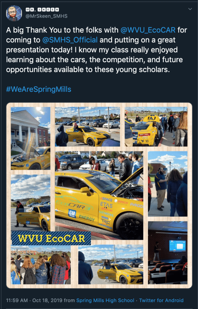 Another one of the teacher’s posted about the team’s visit on Twitter, “A big Thank You to the folks with @WVU_EcoCAR for coming to @SMHS_Official and putting on a great presentation today! I know my class really enjoyed learning about the cars, the competition, and future opportunities to these young scholars.”