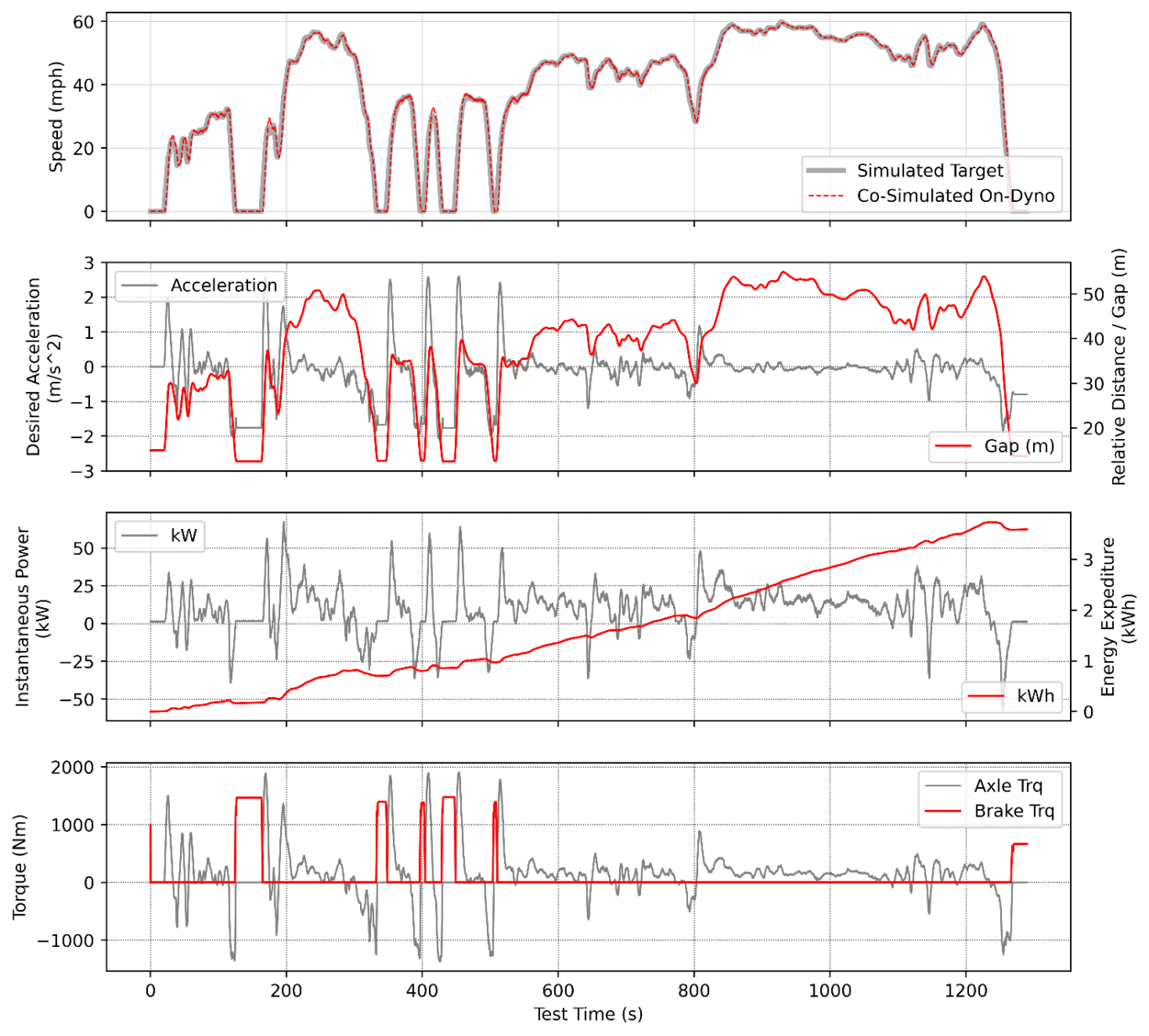 Over the next two weeks, Propulsion Controls and Modeling (PCM) lead, David Ord, and Dr. Goberville will travel to CARB and instrument a LYRIQ for further testing. The research team will be adapting this dynamometer-test methodology for track testing using an Argonne-developed automated scenario replay feature which allows the lead vehicle to automatically follow drive cycles, ensuring the tests are conducted in a repeatable and accurate way. The track testing will be complete in collaboration with the General Motors EcoCAR Organizers at the Milford Proving Ground in 2025.