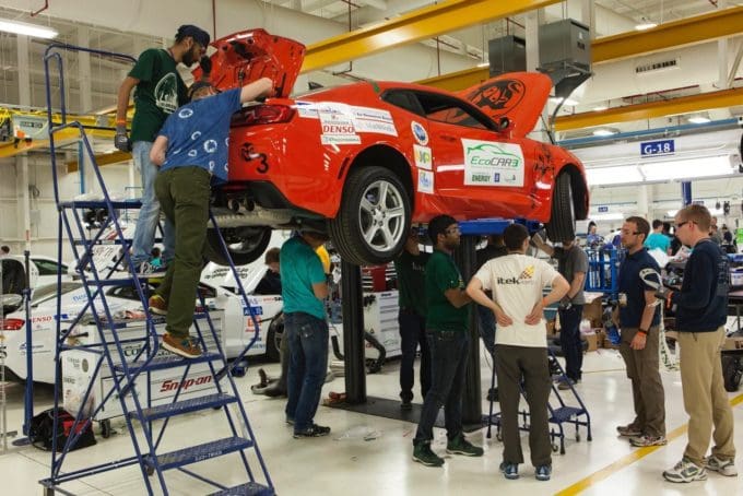 Cranks of wrenches, spinning drills, and clanging metals were the sounds that filled the garage at Colorado State University (CSU) in the weeks leading up to competition. Vehicle disassembly was long underway as students removed the vehicle’s hood, doors, trunk, and the entirety of its interior – stripping a Camaro to its bones. CSU’s Vehicle Innovation Team made their way through the deconstruction phase of the Camaro’s transformation into a hybrid-electric vehicle. The CSU Vehicle Innovation Team removed an existing powertrain and weeks later, the powertrain team implemented their new design.