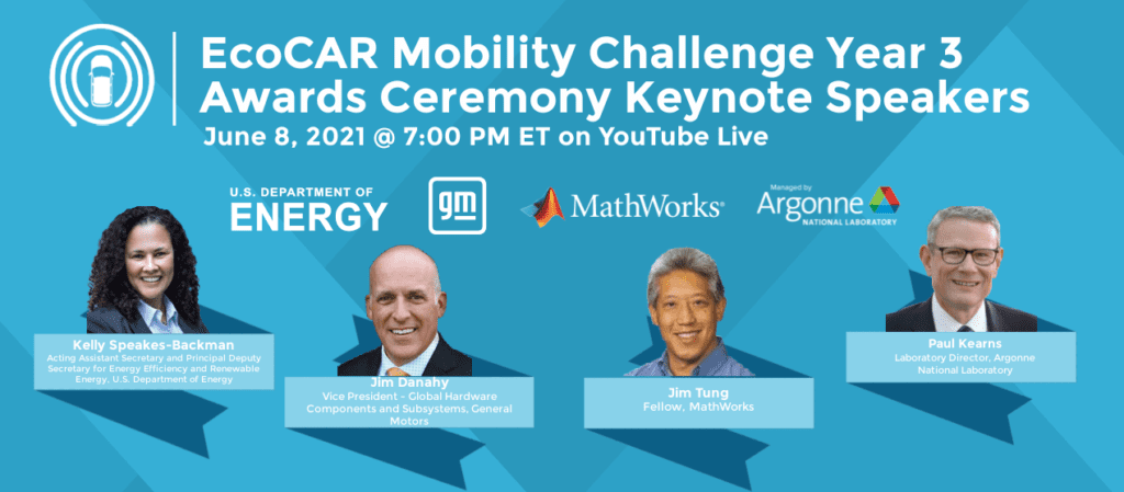 During the ceremony, we will hear keynote remarks from Kelly Speakes-Backman, Acting Assistant Secretary and Principal Deputy Secretary for Energy Efficiency and Renewable Energy, U.S. Department of Energy; Jim Danahy, Vice President – Global Hardware Components and Subsystems, General Motors; Jim Tung, Fellow, MathWorks; and Paul Kearns, Laboratory Director, Argonne National Laboratory.