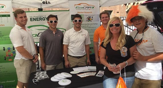East Tennessee Clean Fuels Coalition celebrated the week with three events, and the UTK EcoCAR 3 team was happy to wrap up the week’s festivities. A large crowd gathered to cheer on the UT Volunteers, which gave the EcoCAR 3 team and the East Tennessee Clean Fuels representatives the opportunity to display their vehicles and talk with many UT fans interested in learning about Electric Vehicles (EV) and Hybrid Electric Vehicles (HEVs). Not only were the fans able to see the victory of the UT Volunteers, but they had the opportunity to learn more about EcoCAR 3 and what this program brings to the university.
